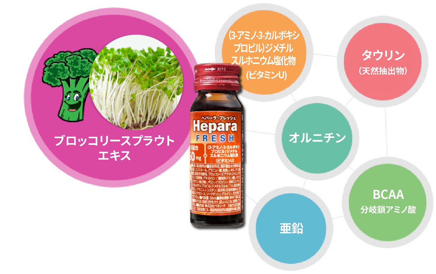[1本(30mL)あたり]エネルギー 8.9kcal、たんぱく質 0.9g、脂質 0.0g、炭水化物 1.3g、食塩相当量 0.03g 原材料名 豚肝臓加水分解物(国内産)、エリスリトール、グラニュー糖、粉飴、L-オルニチン塩酸塩、亜鉛含有酵母、ブロッコリースプラウトエキス、パラチノース加熱物、デキストリン / 酸味料(クエン酸)、ロイシン、タウリン(抽出物)、バリン、イソロイシン、香料((3-アミノ-3-カルボキシプロピル)ジメチルスルホニウム塩化物を含む)、L-アラニン、L-シスチン、保存料(安息香酸Na)、甘味料(スクラロース、ソーマチン)、L-グルタミン、安定剤(アラビアガム)